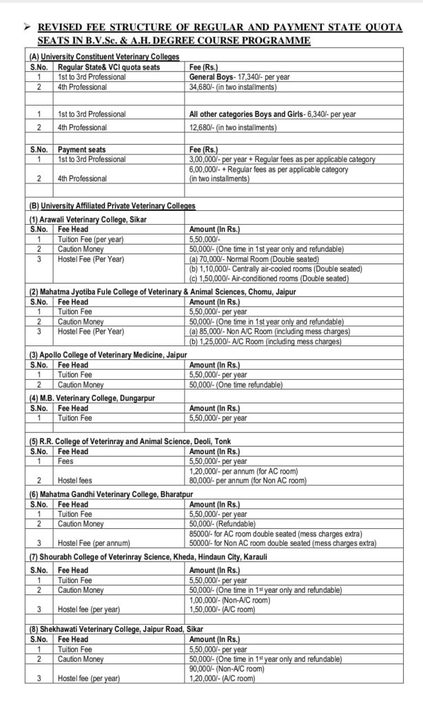 B.V.Sc. fee Structure of Rajasthan